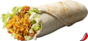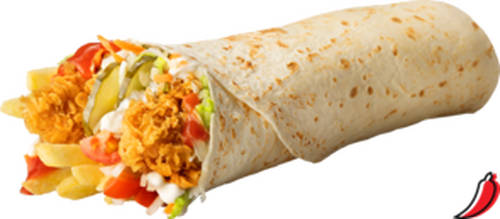 Фантастически большой и неповторимо вкусный! Тройная порция острых куриных стрипсов, гора свежих овощей, картофель фри, смесь коул слоу и идеальное сочетание кетчупа с майонезом в поджаренной лепёшке.