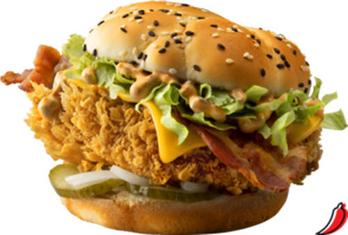 Состав: Булочка с кунжутом, Филе куриное острое, Соус Бургер, Сыр плавленый ломтевой, Салат Айсберг, Бекон варено-копченый, Огурцы маринованные, Лук репчатый