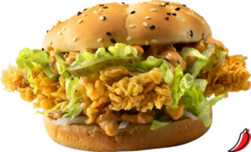 Состав: Булочка с кунжутом, Стрипсы из куриного филе острые, Соус Бургер, Салат Айсберг, Огурцы маринованные, Лук репчатый
